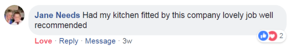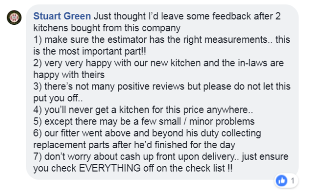 This company has supplied and fitted for me my new kitchen. I have no complaints and would be happy to recommend them to anybody. I have already passed their number to my brother.
