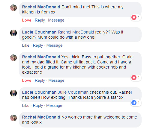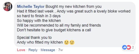 Just wanted to write a quick message to anybody thinking of buying a kitchen from these guys.... Do it!!!! From start to finish everybody has been extremely helpful, the delivery driver was a sweetheart and the fitter worked overtime to get my kitchen finished with 2 days. Looks absolutely out of this world.