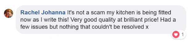 I bought a kitchen from this company, couldn't believe the quality of it. I paid a 1/4 of my next cheapest quote when researching kitchens as my kitchen is huge this included my appliances including washer, oven with hob, my sink with a top of the range tap and all cupboards and worktops. To be honest me and my husband were spectical as we expected to be to good to be true, however we are over the moon our kitchen looks beautiful, and top quality. Highly recommended, brillient customer service and also got a courtesy call. I have recommended to all my friends and family.